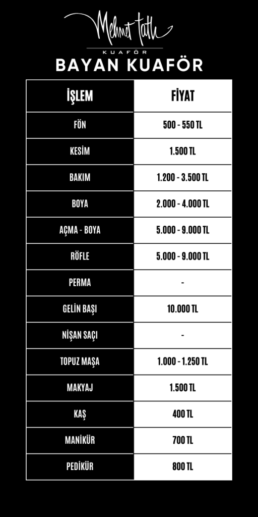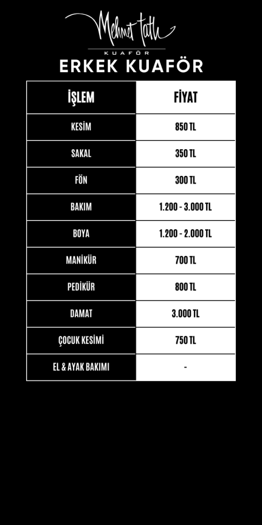 Mehmet Tatlı Kurtköy Kuaför Salonu olarak siz değerli müşterilerimize sunduğumuz hizmetlerin detaylarını ve fiyatlarını bu sayfada bulabilirsiniz. Fiyat listemizi inceleyerek ihtiyacınıza uygun hizmetimizi seçebilir ve randevunuzu kolaylıkla alabilirsiniz. Sizleri salonumuzda ağırlamaktan mutluluk duyarız!